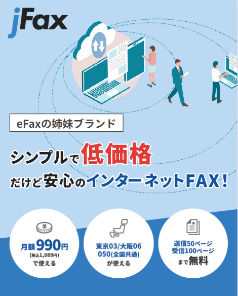 jFaxでは、月額990円(税込1,089円)の料金で、受信100ページと送信50ページが含まれています。